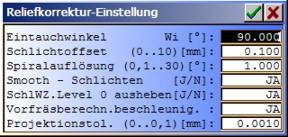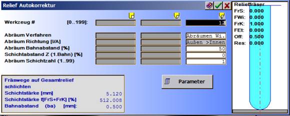 Vertiefte Relieffräsung. Die vertiefte Relieffräsung erfolgt mit der Einstellung Parameter . SchlWZ.Level 0 ausheben = JA. Die Fräsung kann mit Schichten oder auch nur in einer Frässchicht (Standard) erfolgen. Einstellung der Relief AutoKorrektur für eine Frässchicht: