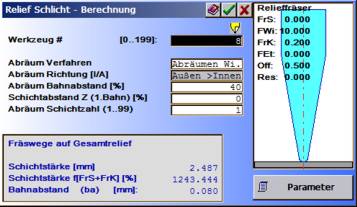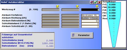 Obersten Relieflevel nicht fräsen. In einigen Fällen (z.B. Lithophane) ist es notwendig leere Bereiche (Z-Level 0 mm) nicht zu fräsen. Dies kann mit Relief AutoKorr . Parameter . SchlWZ.Level 0 ausheben eingestellt werden. Eine ausführliche Anleitung zu diesem Thema erhalten Sie unter Relief aus Foto fräsen.